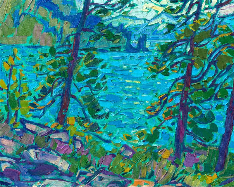Note on varnishing: Erin’s paintings take six to eight weeks to dry, at which time we apply a retouching varnish, which allows the painting to complete the curing process while having a layer of protection against dirt and scuffs. The full curing process for an impasto oil painting takes at least two years. We are happy to assist in applying a final finishing varnish to your Erin Hanson oil painting once it has been dry for at least two years. Here is more information on how to care for your original oil painting.
