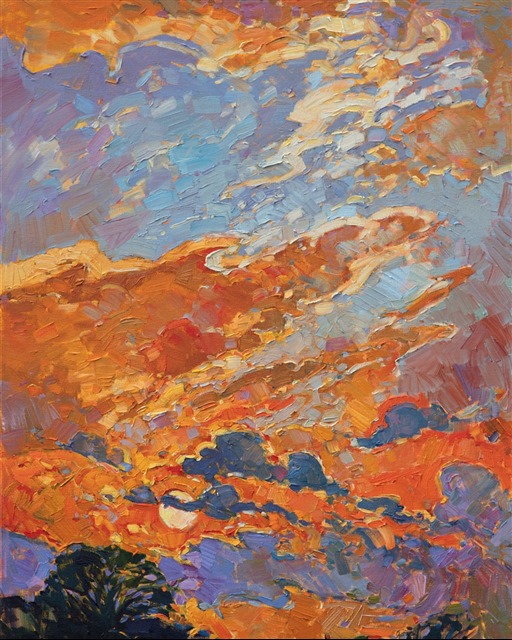 Note on varnishing: Erin’s paintings take six to eight weeks to dry, at which time we apply a retouching varnish, which allows the painting to complete the curing process while having a layer of protection against dirt and scuffs. The full curing process for an impasto oil painting takes at least two years. We are happy to assist in applying a final finishing varnish to your Erin Hanson oil painting once it has been dry for at least two years. Here is more information on how to care for your original oil painting.