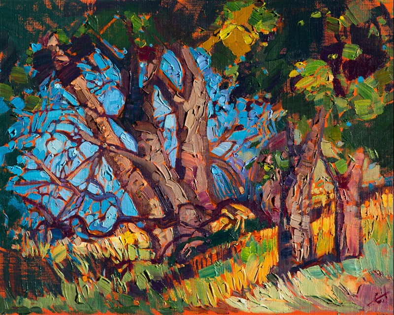 Beautiful color comes together in this oil painting of California oak trees, each brush stroke vivid and alive.