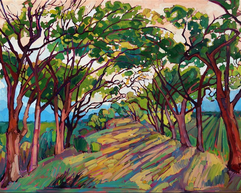 Style: "Open Impressionism" is a new style of painting developed by American artist Erin Hanson. The style is characterized by short, impasto brush strokes that are applied without layering, creating a mosaic or stained-glass appearance to the paintings. The paintings are created with a limited palette of colors, applied without blending or mixing upon the canvas, which adds a dimension of texture to each brush stroke. Inspired by classic impressionism, pointillism, and post-impressionism, Erin Hanson continues the tradition of impressionism into the modern day with her colorful and vivacious landscape paintings.