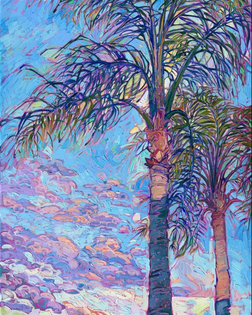 Long palm tree fronds wave in the tropical winds, creating criss-crossing patterns of light and color against the blue sky. Thick brush strokes of oil paint create a texture of stained glass on the canvas. Erin Hanson creates Open Impressionism paintings by placing her paint strokes side by side, without layering, creating a mosaic effect of color and luminous light.