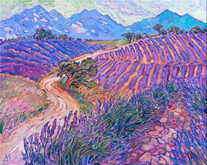 Note on varnishing: Erin’s paintings take six to eight weeks to dry, at which time we apply a retouching varnish, which allows the painting to complete the curing process while having a layer of protection against dirt and scuffs. The full curing process for an impasto oil painting takes at least two years. We are happy to assist in applying a final finishing varnish to your Erin Hanson oil painting once it has been dry for at least two years. Here is more information on how to care for your original oil painting.