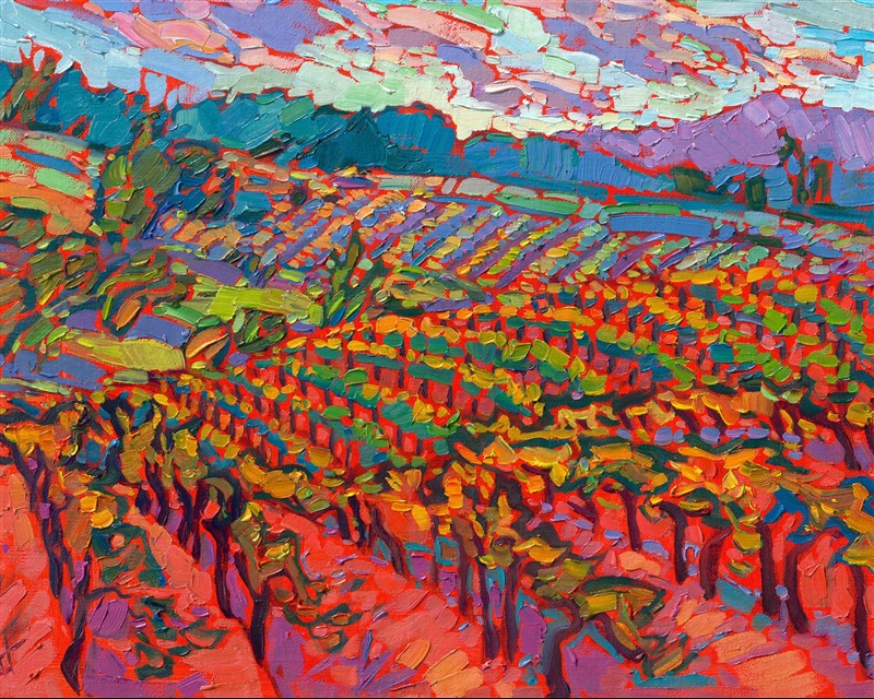 Note on varnishing: Erin’s paintings take six to eight weeks to dry, at which time we apply a retouching varnish, which allows the painting to complete the curing process while having a layer of protection against dirt and scuffs. The full curing process for an impasto oil painting takes at least two years. We are happy to assist in applying a final finishing varnish to your Erin Hanson oil painting once it has been dry for at least two years. Here is more information on how to care for your original oil painting.