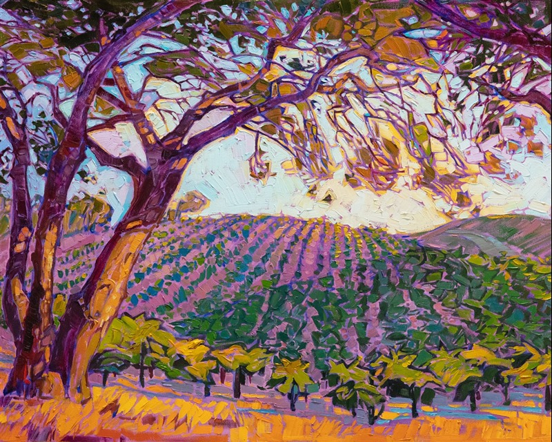 "Vineyard Oak" was created on 1-1/2" canvas, with the painting continued around the edges. The piece arrives framed in a gold floating frame.