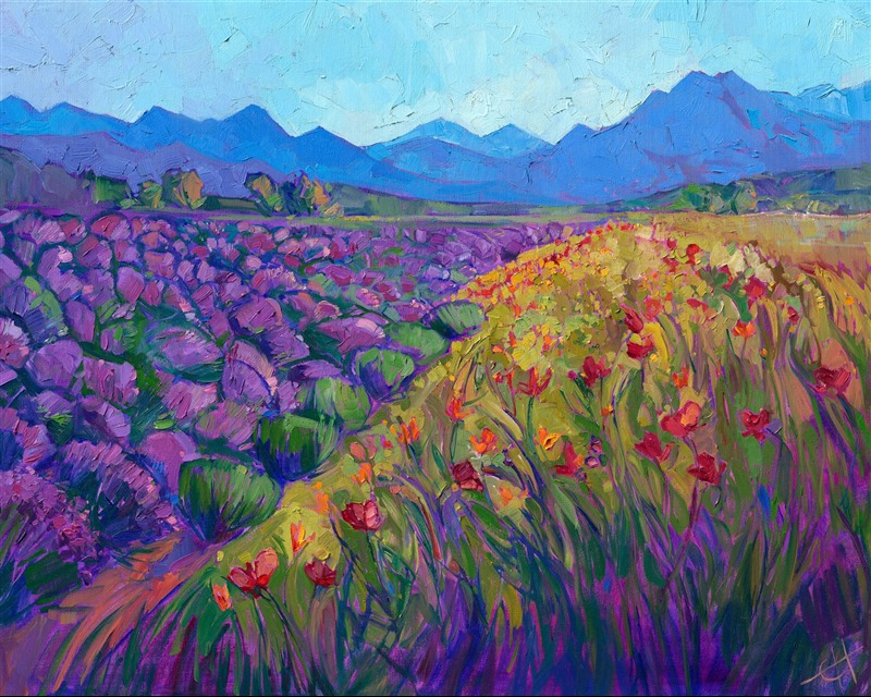 Erin Hanson had always wanted to paint lavender fields, so on her way to an art show in Bellevue, WA, she drove up to Sequim, a northwestern paradise famous for its lavender fields. This painting captures the natural beauty of its cultivated lands.