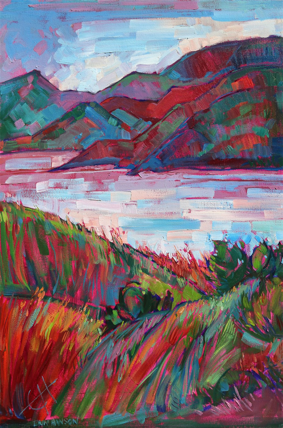 Style: "Open Impressionism" is a new style of painting developed by American artist Erin Hanson. The style is characterized by short, impasto brush strokes that are applied without layering, creating a mosaic or stained-glass appearance to the paintings. The paintings are created with a limited palette of colors, applied without blending or mixing upon the canvas, which adds a dimension of texture to each brush stroke. Inspired by classic impressionism, pointillism, and post-impressionism, Erin Hanson continues the tradition of impressionism into the modern day with her colorful and vivacious landscape paintings.