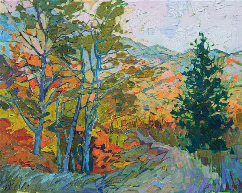 Style: "Open Impressionism" is a new style of painting developed by American artist Erin Hanson. The style is characterized by short, impasto brush strokes that are applied without layering, creating a mosaic or stained-glass appearance to the paintings. The paintings are created with a limited palette of colors, applied without blending or mixing upon the canvas, which adds a dimension of texture to each brush stroke. Inspired by classic impressionism, pointillism, and post-impressionism, Erin Hanson continues the tradition of impressionism into the modern day with her colorful and vivacious landscape paintings.
