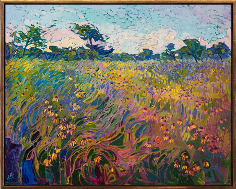 "Wildflower Lights" was created on 1-1/2" canvas, with the painting continued around the edges. The painting arrives framed in a contemporary gold floater frame.