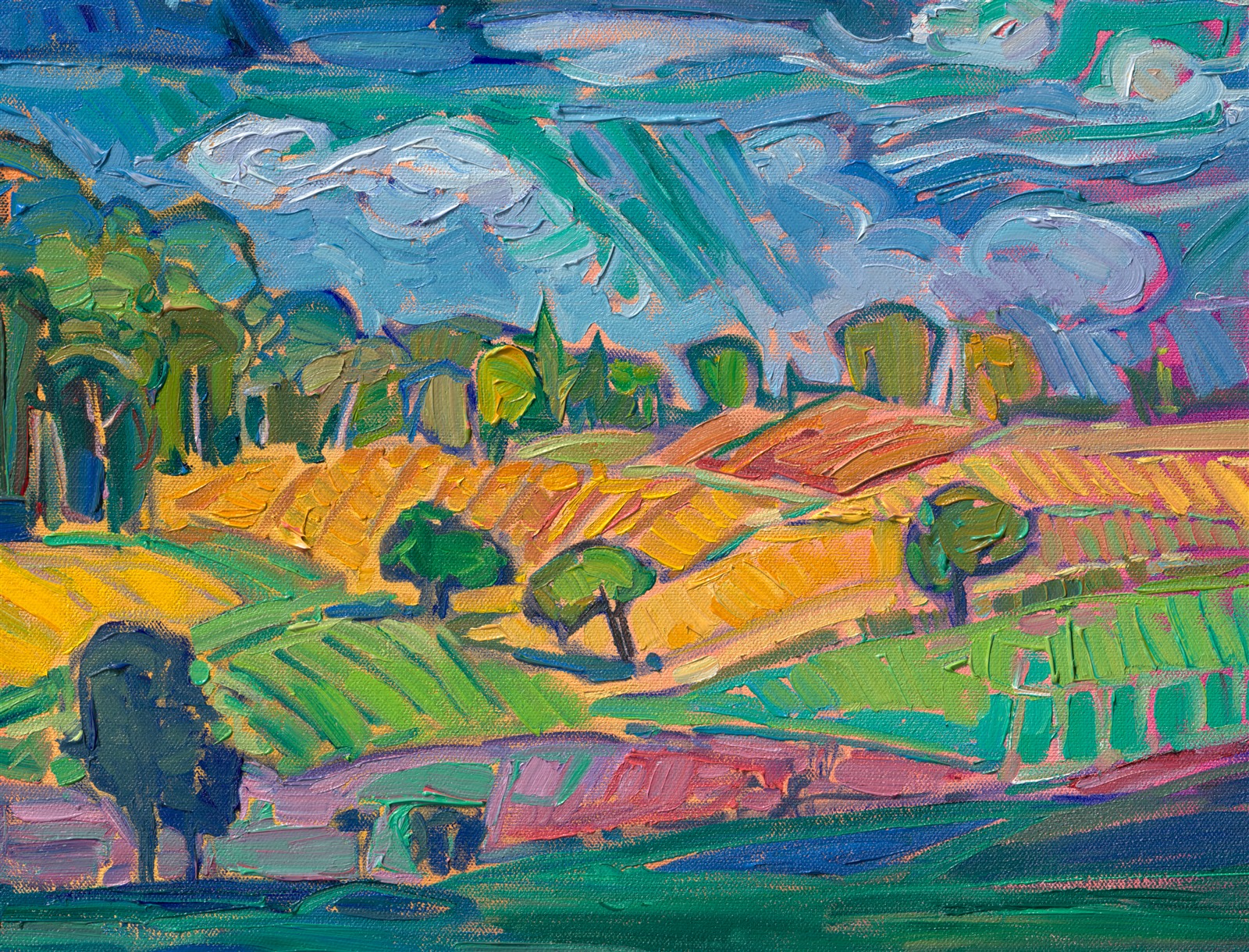 Oregon's Willamette Valley is a lush countryside with just enough rain to keep the landscape green. After the rain, the clouds part, and the rolling hills and vineyards are bathed in warm sunlight. This painting captures that moment when the clouds first part and the word is illuminated with color.