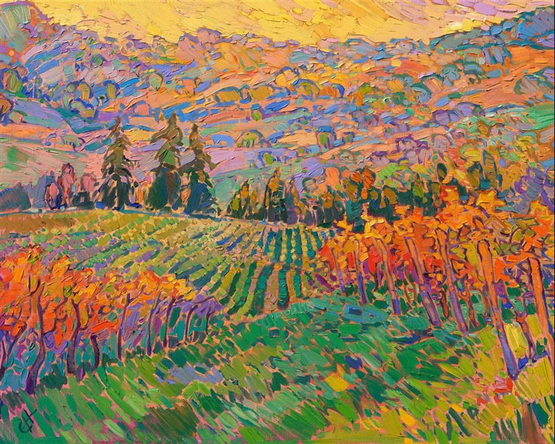 This impressionist painting of Oregon wine country captures the beautiful colors of the Dundee hills just before sunset. The rolling hills are covered in vineyards and pine trees, forming patterns of light and color across the landscape. This painting was created in Erin Hanson's Open Impressionism style, with thick, bold brush strokes that are applied without overlapping.