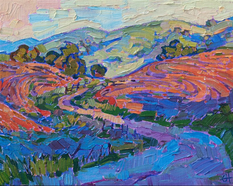 Winding hills of Paso Robles are captured in small brush strokes on this petite canvas. The painting brings to life the beautiful light of early morning in California's wine country region.