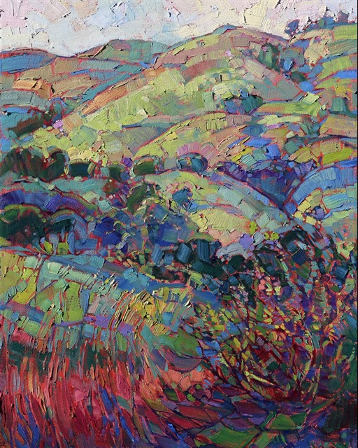Style: "Open Impressionism" is a new style of painting developed by American artist Erin Hanson. The style is characterized by short, impasto brush strokes that are applied without layering, creating a mosaic or stained-glass appearance to the paintings. The paintings are created with a limited palette of colors, applied without blending or mixing upon the canvas, which adds a dimension of texture to each brush stroke. Inspired by classic impressionism, pointillism, and post-impressionism, Erin Hanson continues the tradition of impressionism into the modern day with her colorful and vivacious landscape paintings.