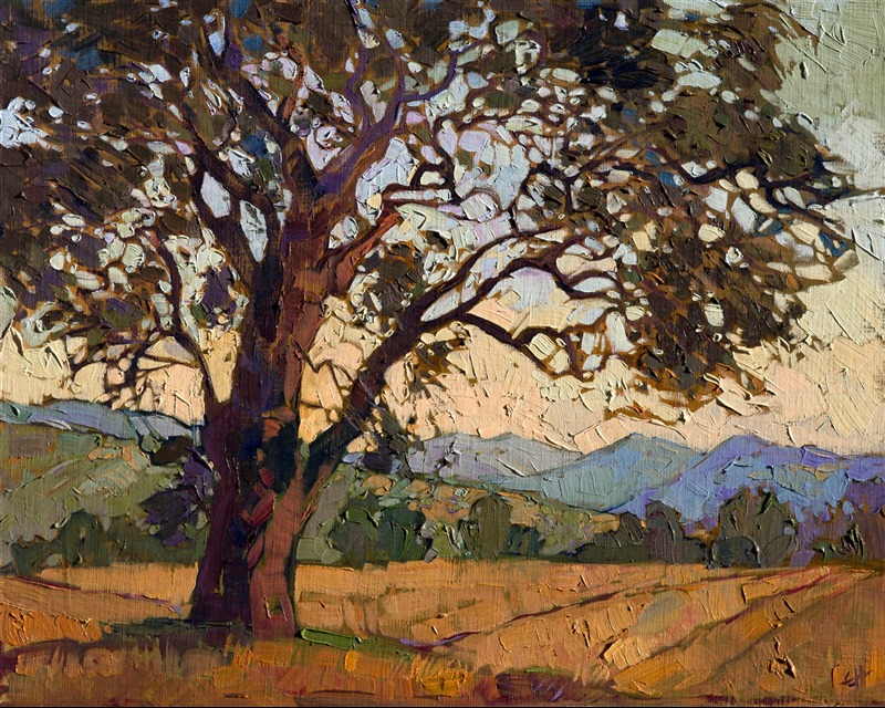 Dusky colors of summer come together in a beautiful symphony of color and texture. This painting of Paso Robles is a gorgeous example of Hanson's style of Open Impressionism, from the filtered mosaic sky light to the loosely applied brush strokes of the foreground.