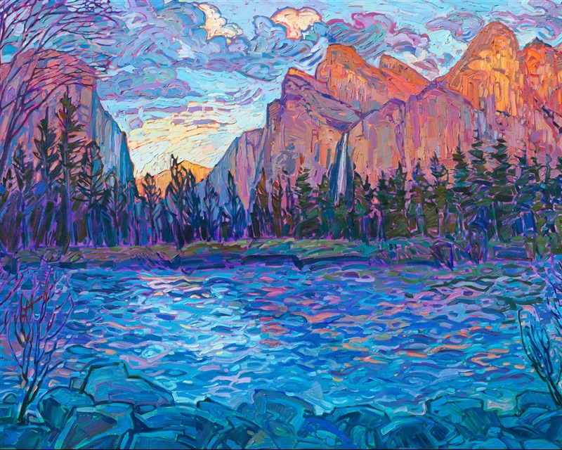 "Yosemite Impression" is available for pre-purchase and will be included in the Erin Hanson: Landscapes of the West solo museum exhibition at the Sears Art Museum in St. George, Utah. This museum exhibition, located at the gateway to Zion National Park, will showcase Erin Hanson's largest collection of Western landscape paintings, including paintings of Zion, Bryce, Arches, Cedar Breaks, Arizona, and other Western inspirations. The show will be displayed from June 7 to August 23, 2024.