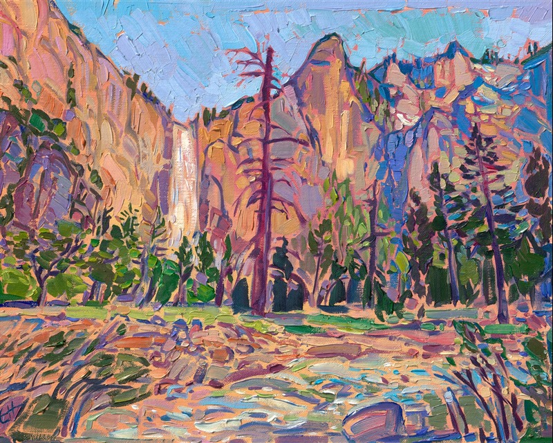 "Yosemite Light" is an original oil painting on linen board, done in Erin Hanson's signature Open Impressionism style. The piece arrives framed in a wide, mock floater frame finished in black with gold edging.