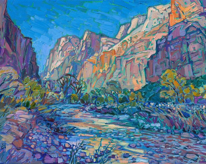 ERIN HANSON has been painting in oils since she was 8 years old. As a teenager, she apprenticed at a mural studio where she worked on 40-foot-long paintings while selling art commissions on the side. After being told it was too hard to make a living as an artist, she got her degree in Bioengineering from UC Berkeley. Afterward, Erin became a rock climber at Red Rock Canyon, Nevada. Inspired by the colorful scenery she was climbing, she decided to return to her love of painting and create one new painting every week.