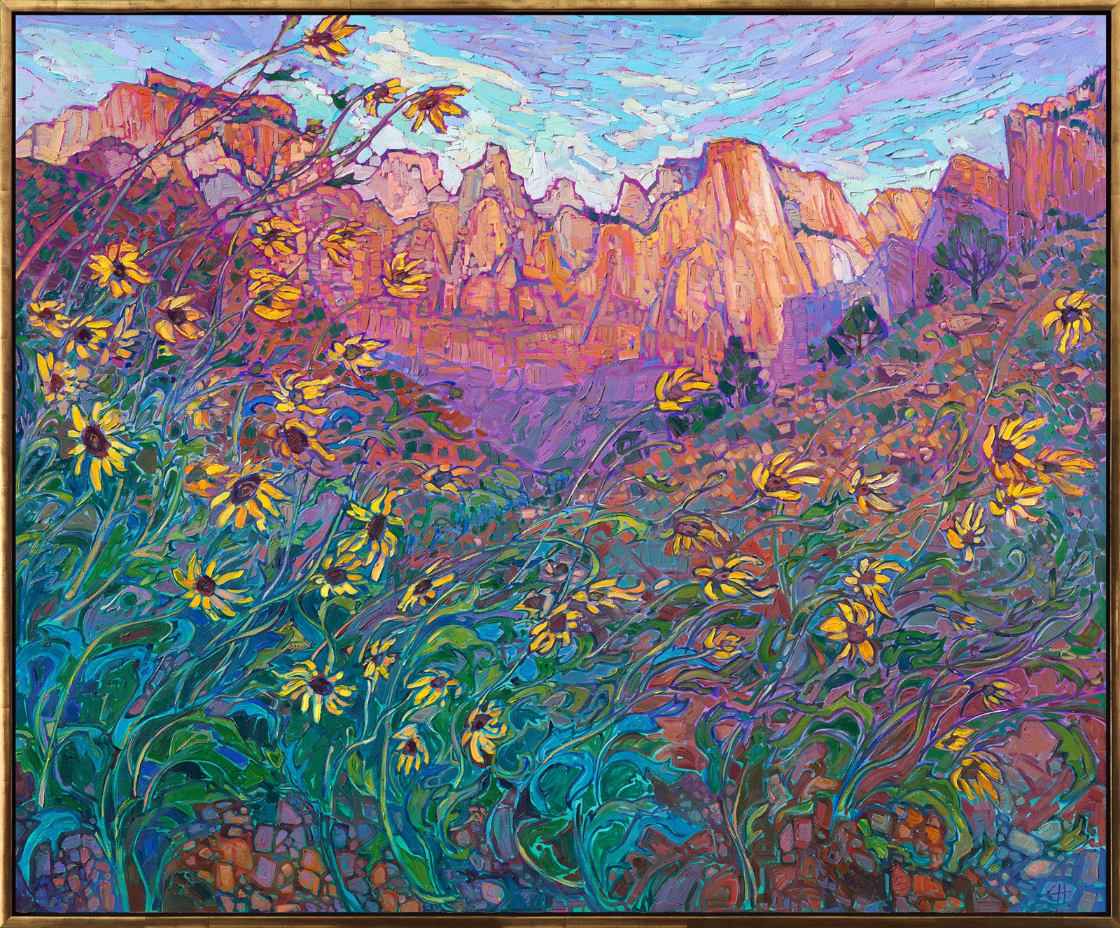 Zion National Park is captured in bold, impressionistic color, in Hanson's iconic Open Impressionism style. The brush strokes are thickly applied without overlapping, creating a mosaic of color and texture across the canvas. This large painting re-creates all the grandeur of southern Utah.