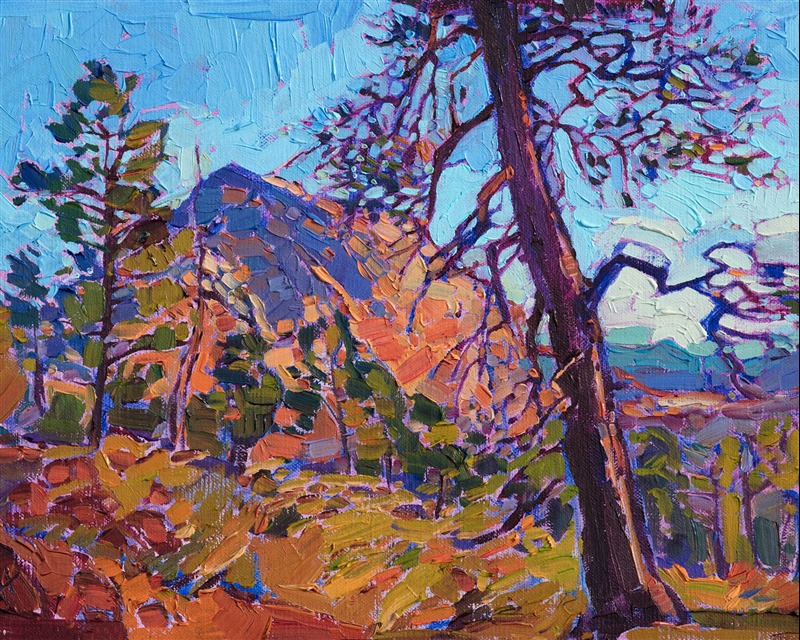 ERIN HANSON has been painting in oils since she was 8 years old. As a teenager, she apprenticed at a mural studio where she worked on 40-foot-long paintings while selling art commissions on the side. After being told it was too hard to make a living as an artist, she got her degree in Bioengineering from UC Berkeley. Afterward, Erin became a rock climber at Red Rock Canyon, Nevada. Inspired by the colorful scenery she was climbing, she decided to return to her love of painting and create one new painting every week.