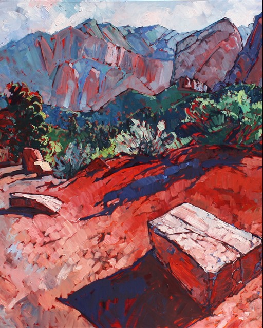 Man-cut sandstone rock at a pullout in Kolob Canyon (Zion National Park.) The brush strokes in this oil painting are thick and impressionistc.