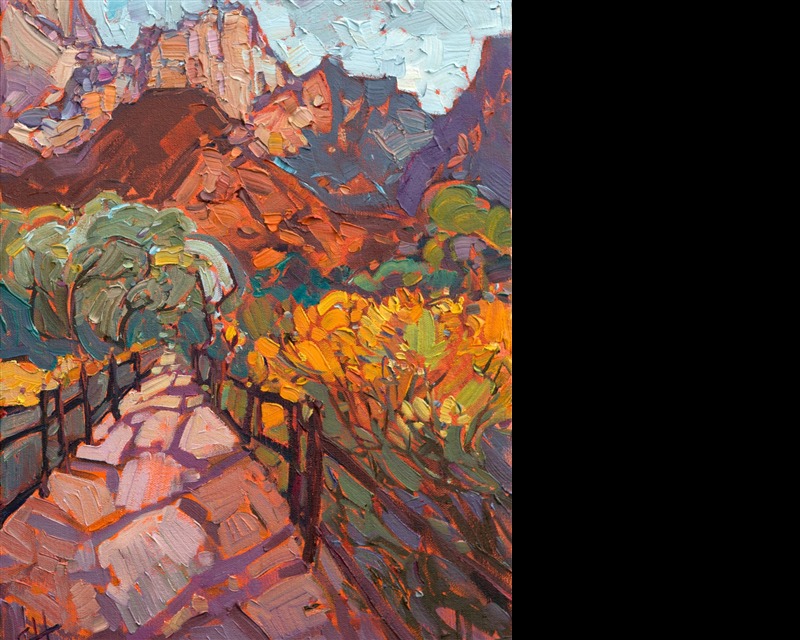 ERIN HANSON has been painting in oils since she was 8 years old. As a teenager, she apprenticed at a mural studio where she worked on 40-foot-long paintings while selling art commissions on the side. After being told it was too hard to make a living as an artist, she got her degree in Bioengineering from UC Berkeley. Afterward, Erin became a rock climber at Red Rock Canyon, Nevada. Inspired by the colorful scenery she was climbing, she decided to return to her love of painting and create one new painting every week.