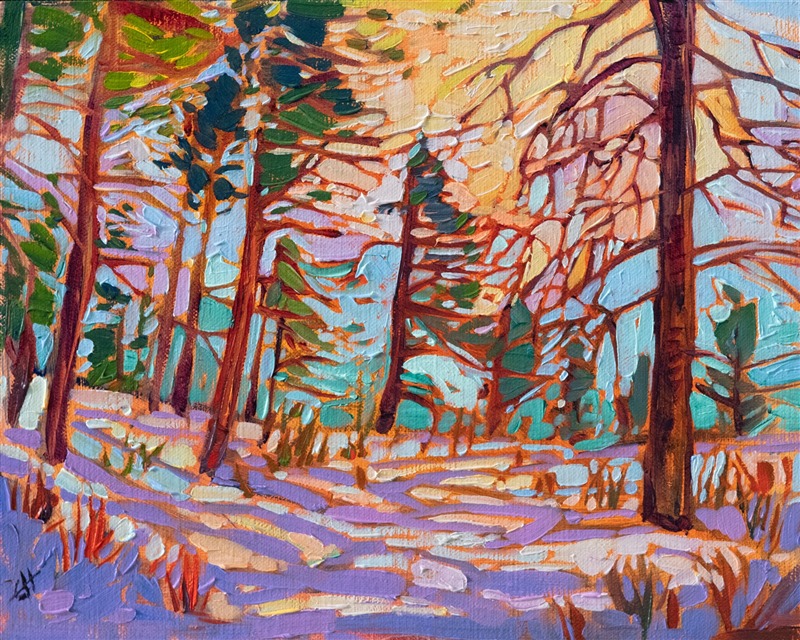 Hiking through east Zion on freshly fallen snow was an experience I'll never forget. The sun came out briefly in the middle of the day, casting long shadows of lavender across the pristine snow. The impressionistic quality of the painting captures the mood and natural beauty of the scene.